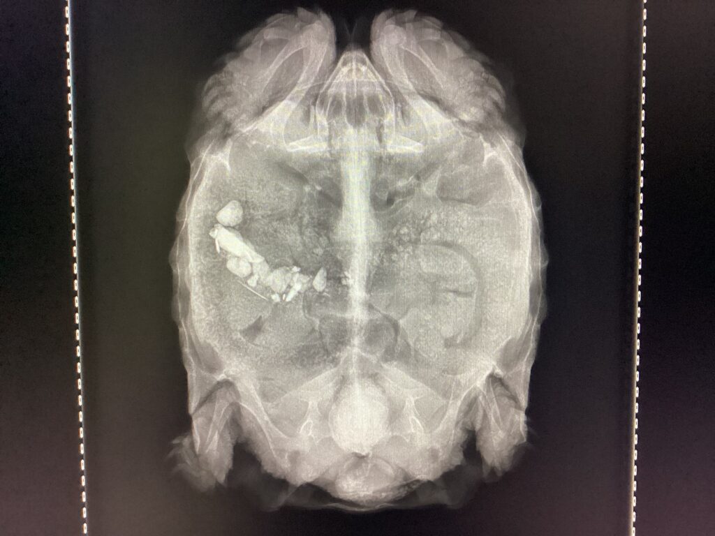 写真の子は総排泄腔に結石ができたことで排泄が困難になっており、便秘になっていることがレントゲンから分かります。この子は小石や砂利を誤食してしまってもいます。