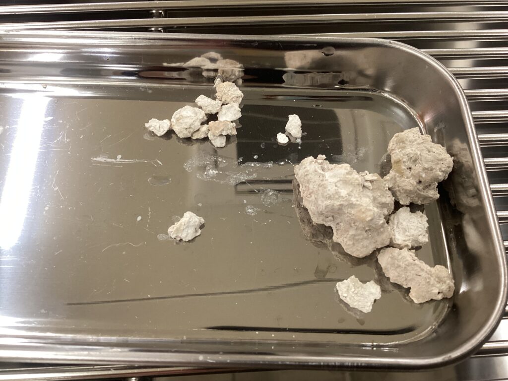 幸いこの子は外からのアプローチが可能であったため、破砕して摘出を行いましたが、場合によっては開腹手術が必要になるため注意が必要です。